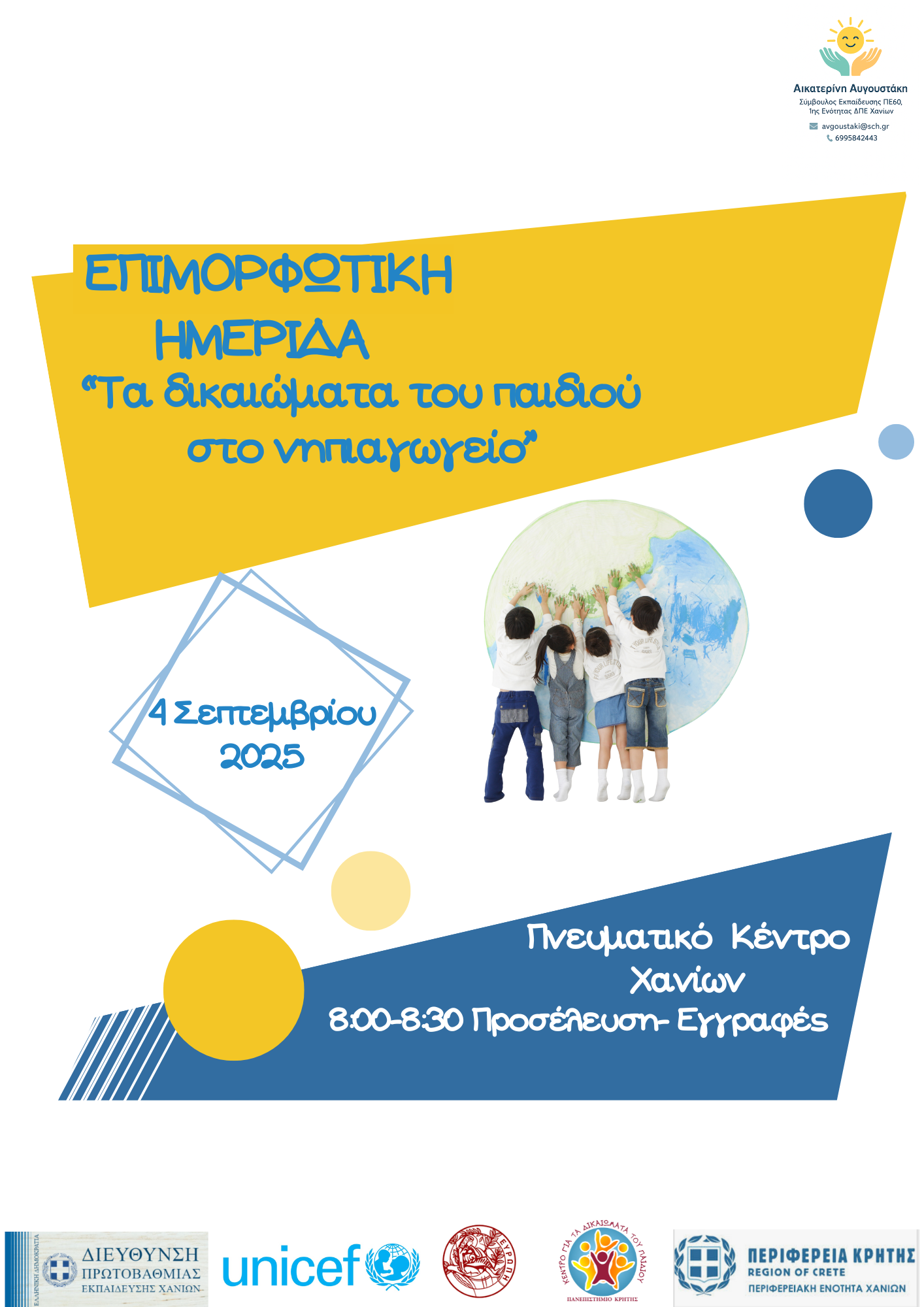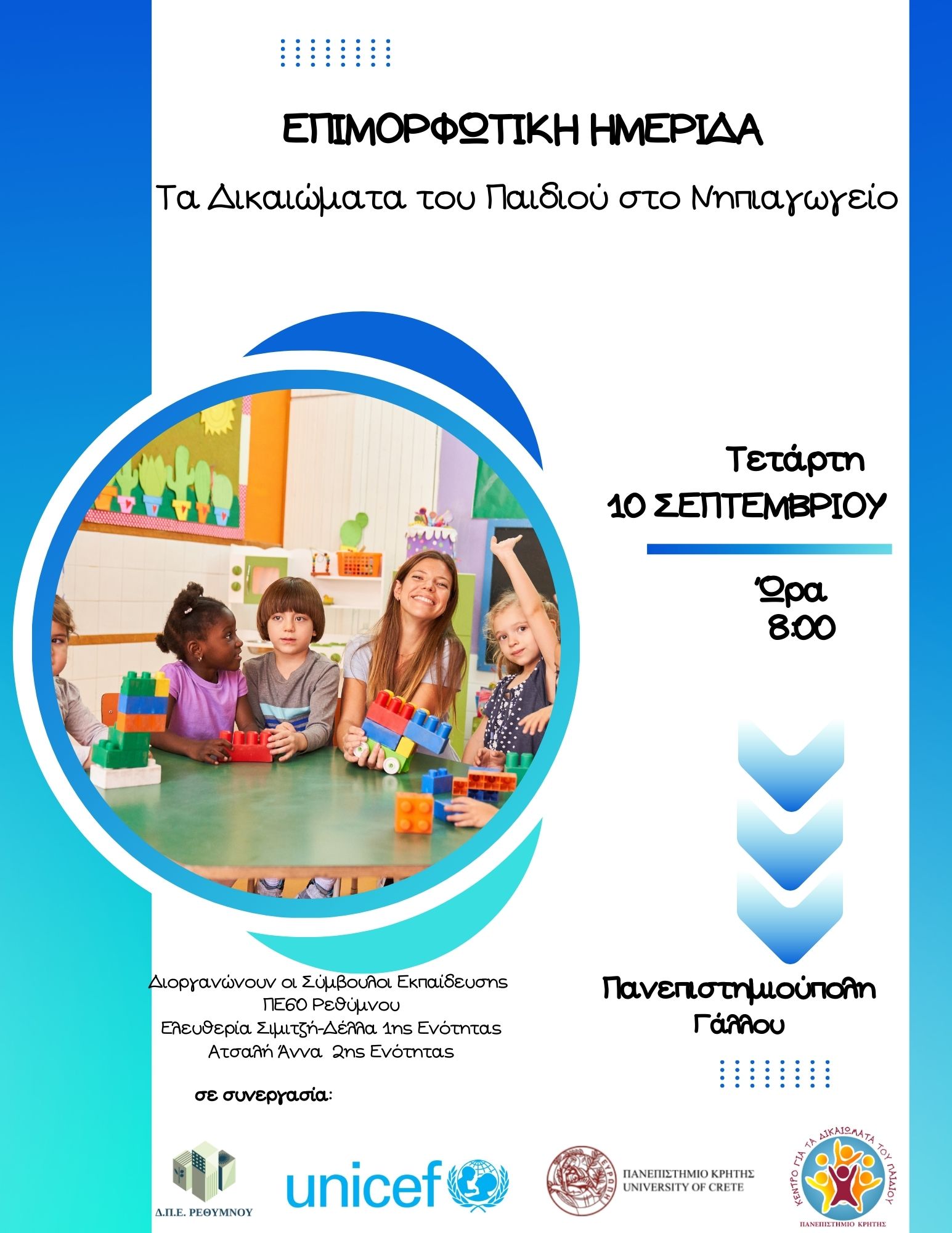 Το Κέντρο για τα Δικαιώματα του Παιδιού και το ΚΕΔΙΒΙΜ του Πανεπιστημίου Κρήτης διοργανώνουν με την UNICEF, τις Συμβούλους Εκπαίδευσης Κρήτης και τις Επόπτριες Ποιότητας Εκπαίδευσης των Διευθύνσεων της Πρωτοβάθμιας Εκπαίδευσης Κρήτης, μια σειρά από Επιμορφωτικές Ημερίδες / Βιωματικά Εργαστήρια σχετικά με τα Δικαιώματα του Παιδιού.